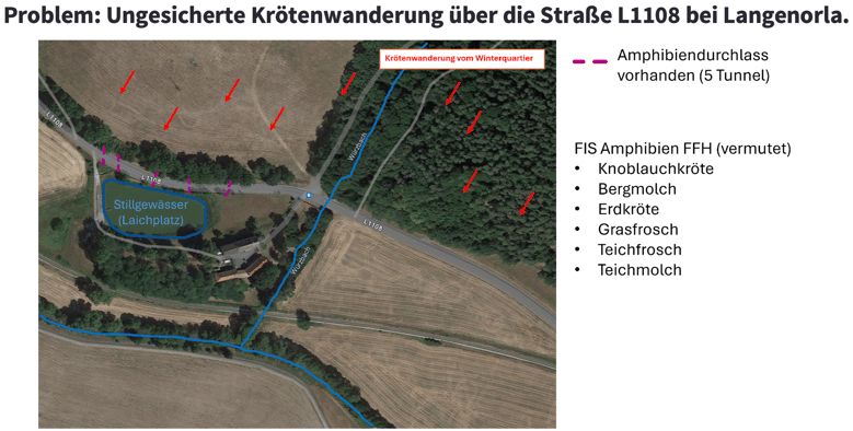 nur wenige Meter nördlich verlaufenden L1108 seit jeher eine tödliche Gefahr für diese gesetzlich geschützten Arten dar.