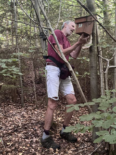 An anderer Stelle ist die Freude größer: In Kasten Nr. 35 hat sich eine Haselmaus-Familie mit fünf Jungtieren eingenistet. Die Arbeit ist aufwendig: Kontrollgänge dauern oft acht Stunden. Neben den Kästen installiert Jörg auch Audio-Logger, um die Lautäußerungen der Haselmaus zu erforschen. Viele ihrer Töne liegen im Ultraschallbereich – für uns Menschen unhörbar. Dafür hat er die Deckel einiger Kästen modular gestaltet, sodass hier je nach Interesse unterschiedliche Vorrichtungen integriert werden können. Die Ergebnisse seiner Beobachtungen sollen später in einer Fachzeitschrift veröffentlicht werden.