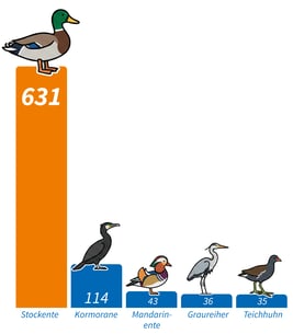 Insgesamt wurden 993 Vögel und 21 verschiedene Arten erfasst. Besonders häufig vertreten waren: