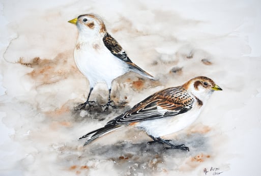 Schneeammern auf Helgoland, Aquarell, Berrit Gatrz