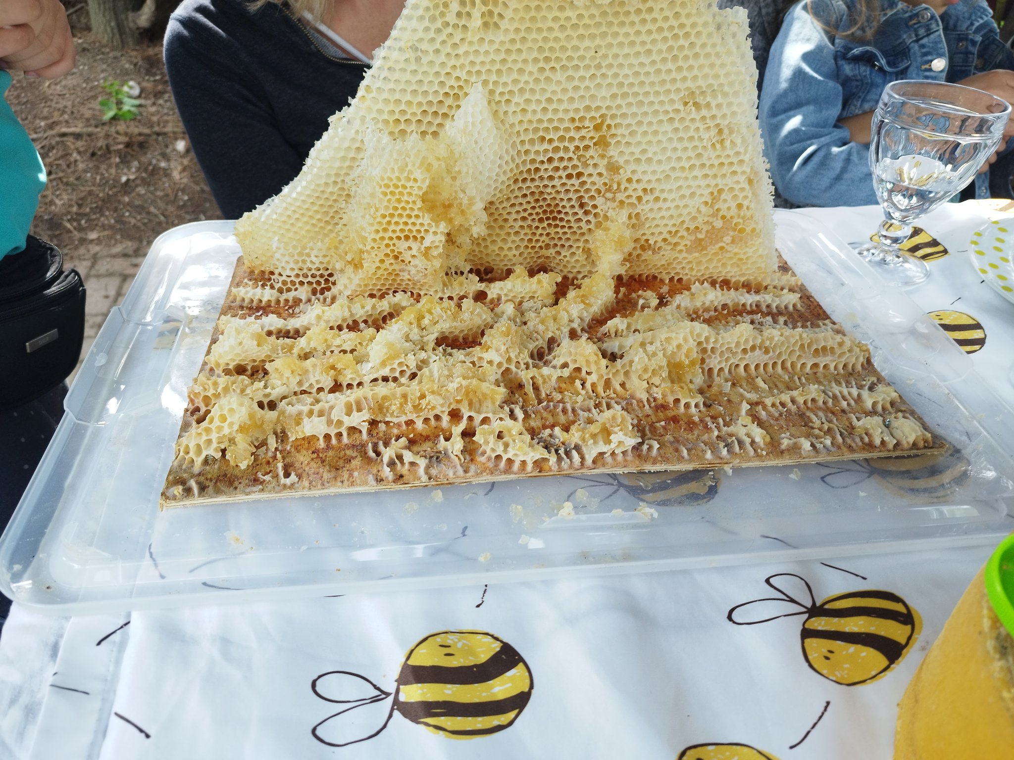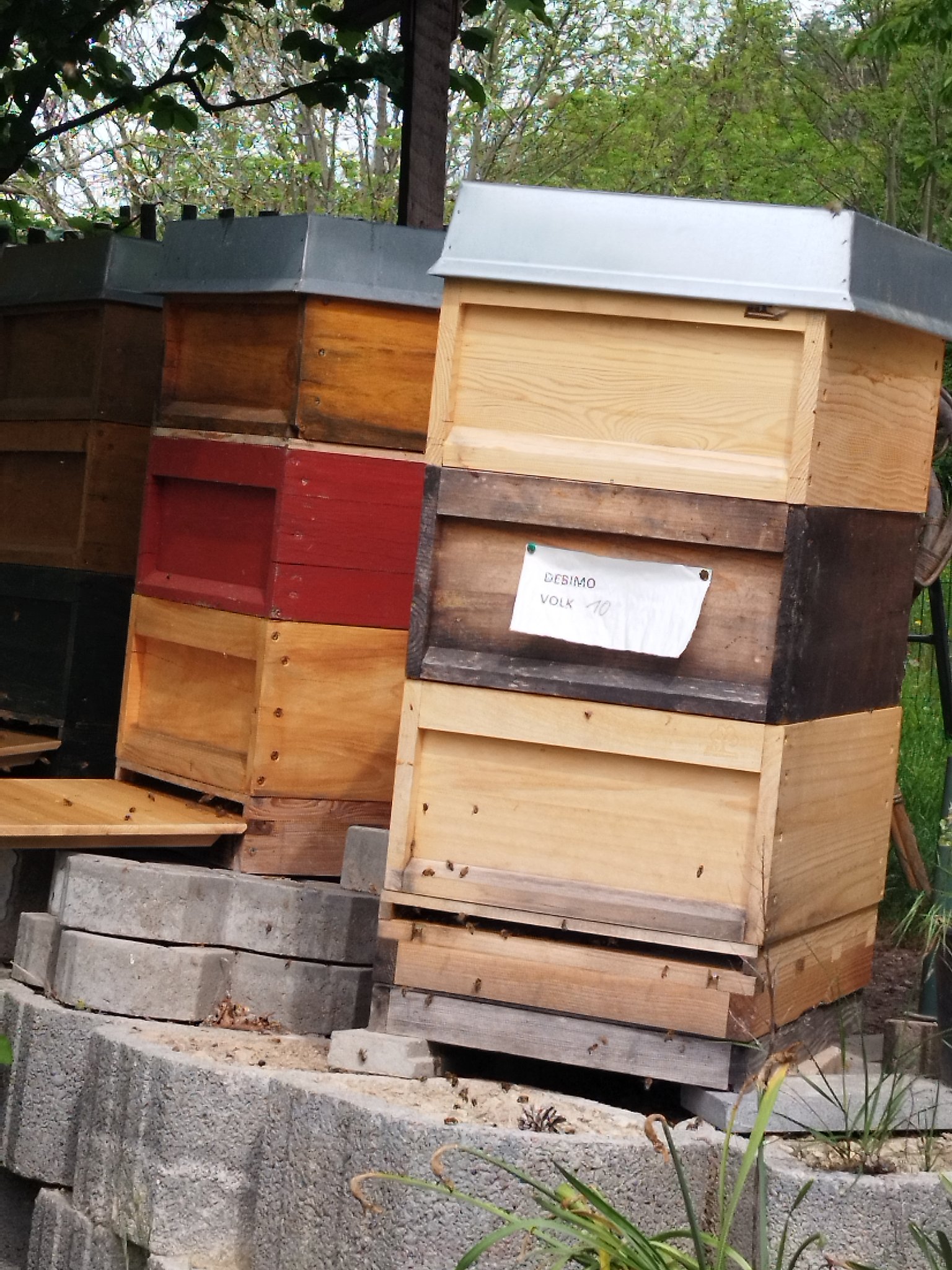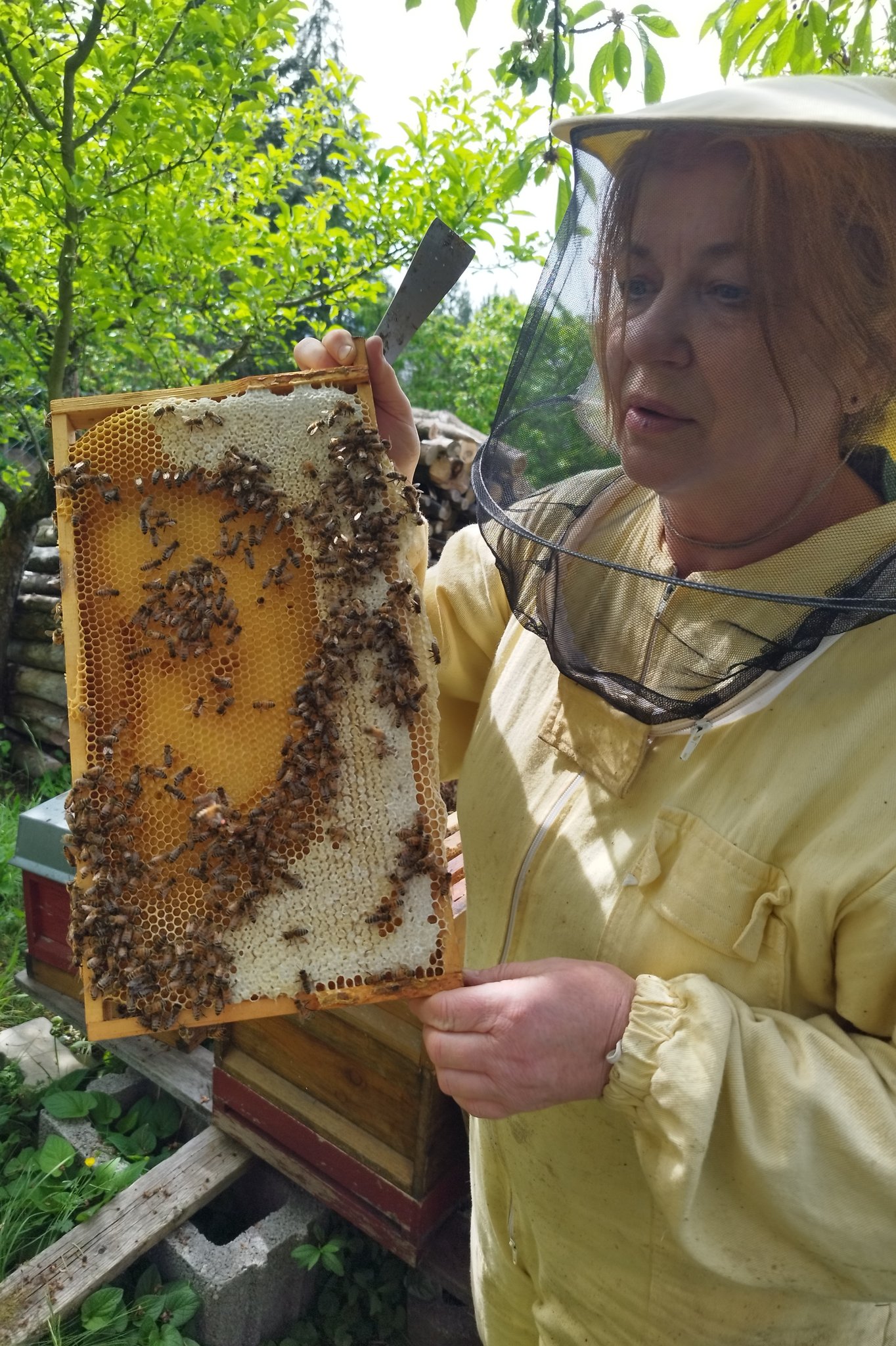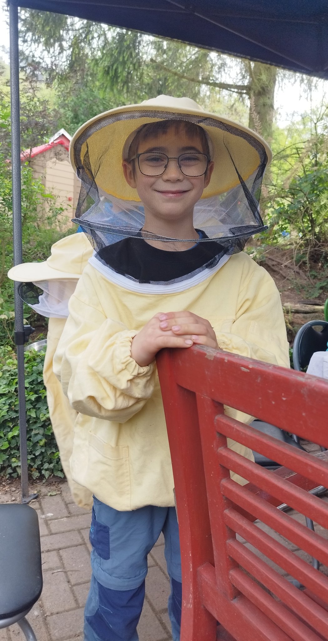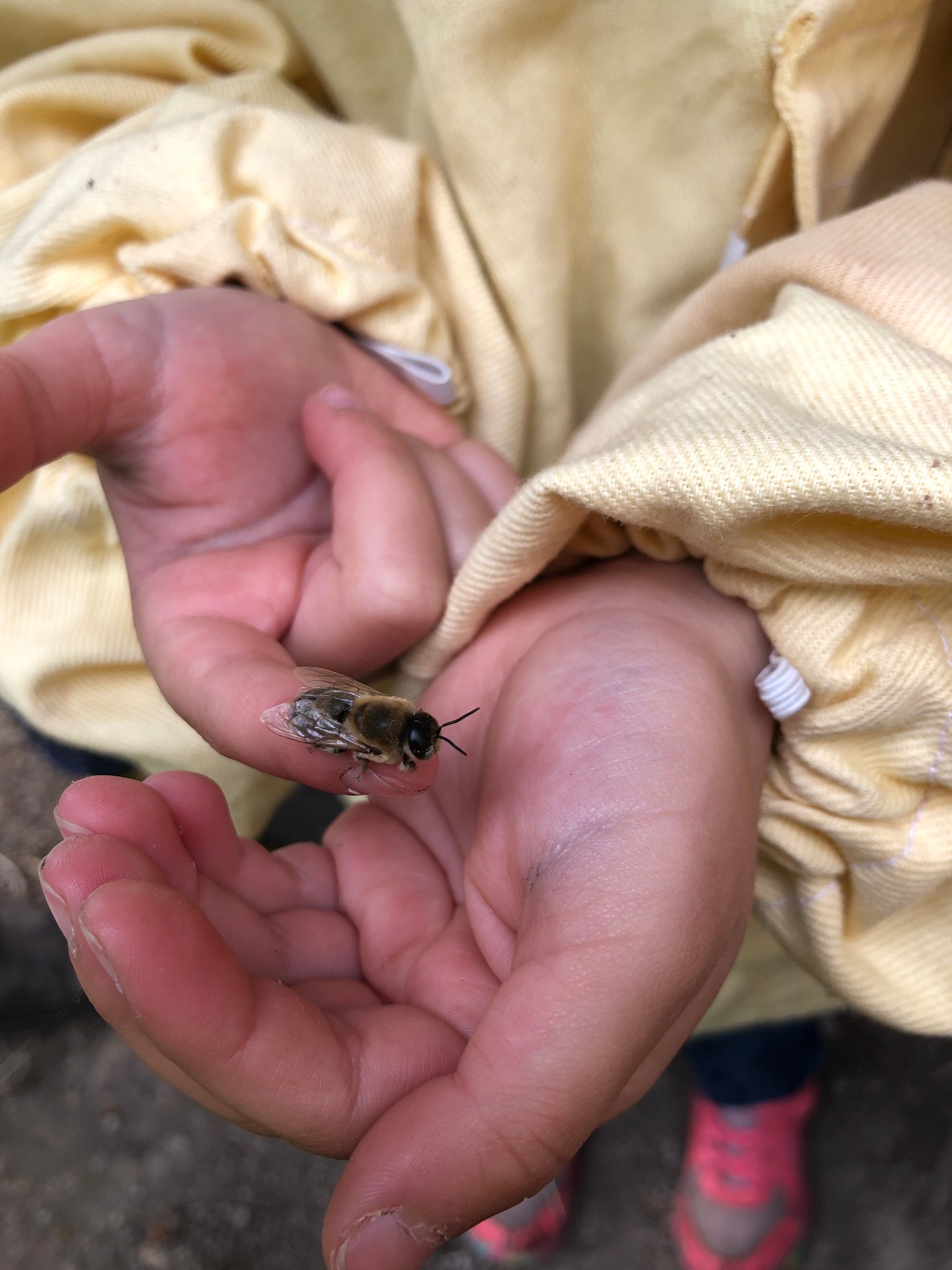 Nachdem wir uns im Frühjahr in mehreren Gruppenstunden mit Honigbienen und Wildbienen beschäftigt hatten, besuchten wir am 11. Mai im Alt-Lobeda den Bienenstand der Familie Schlegel, die im Jenaer Imkerverein aktiv sind. Frau Schlegel erklärte uns den Aufbau eines Bienenstandes, erzählte uns vom Leben der Honigbienen und ihrer Arbeit als Imkerin. Während wir ihr zuhörten, durften wir leckeren Honig kosten. Danach zogen wir uns Imkeranzüge an und gingen zu den Bienenstöcken. Frau Schlegel zeigte uns, wie ein Bienenstock aufgebaut ist und nahm einzelne Rähmchen heraus, damit wir die Königin, die Larven und die vielen Arbeiterinnen sehen konnten. Wir durften die Bienen sogar streicheln.