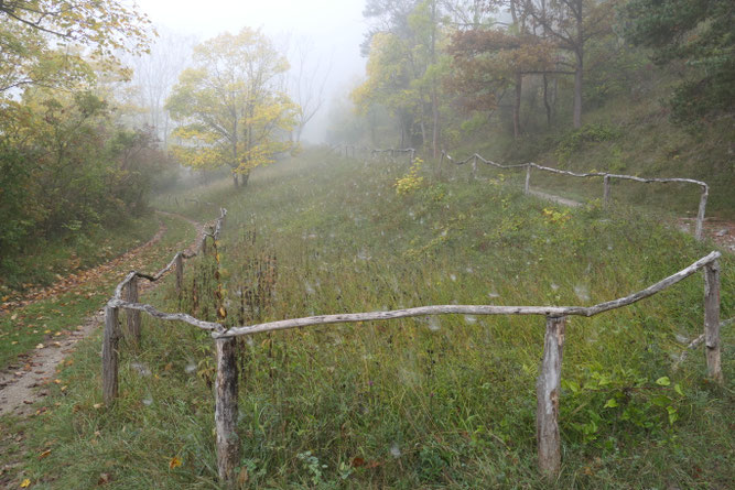 So sah die noch nicht gepflegte kleine Wiese bei der Bank zu Ehren von Frau Dr. Helga Dietrich am 3. Oktober aus. Auf dieser Wiese kommen Helm-, Purpur- und Hybridknabenkraut, Grünliche und Weiße Waldhyazinthe, Fliegen- und Bienenragwurz, Großes Zweiblatt, Mückenhändelwurz und Bocksriemenzunge vor. Die an vielen Stellen defekte Umzäunung soll eigentlich dazu dienen, Besucher vom Betreten der Fläche abzuhalten.