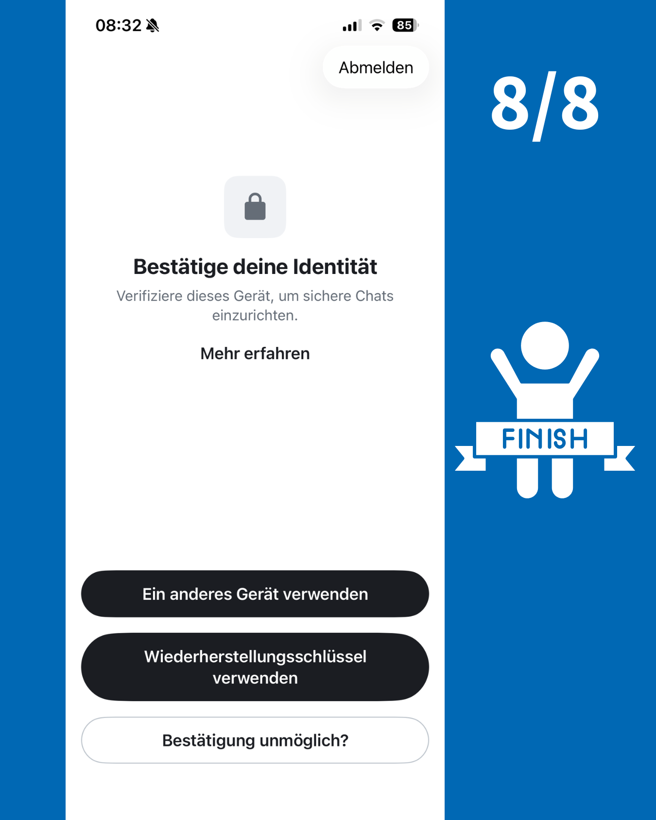 Wenn du dich bereits auf einem Gerät mit dem NABU-Chat verbunden hast, dann wirst du bei der Einrichtung an einem anderen Gerät nach einer Bestätigung deiner Identität gefragt. Dies geht am einfachsten, wenn du parallel dein anderes Gerät wie die Webseite https://chat.nabu-netz.de öffnest und dann auf beiden Geräten der Anweisung zur Verifizierung folgst.