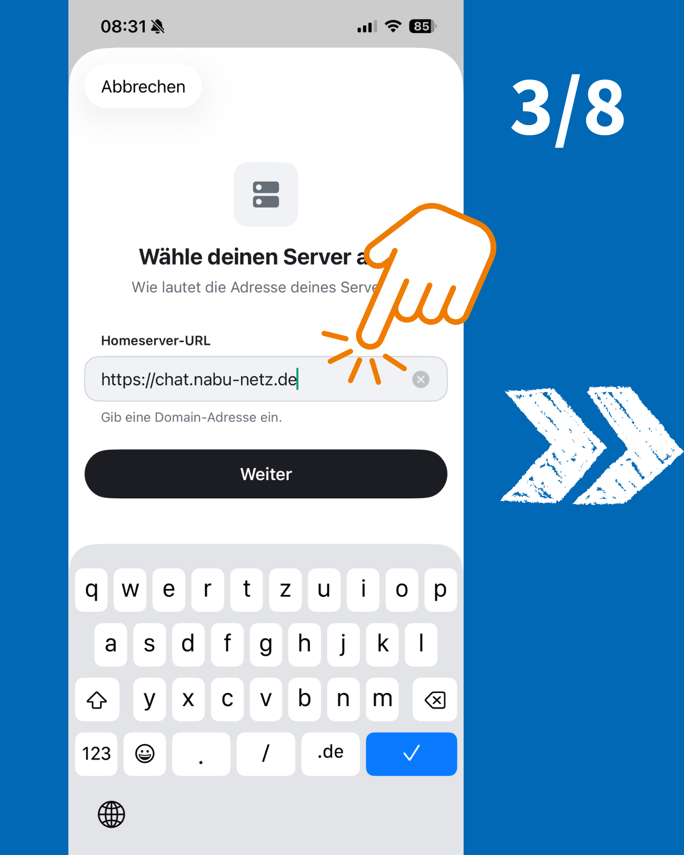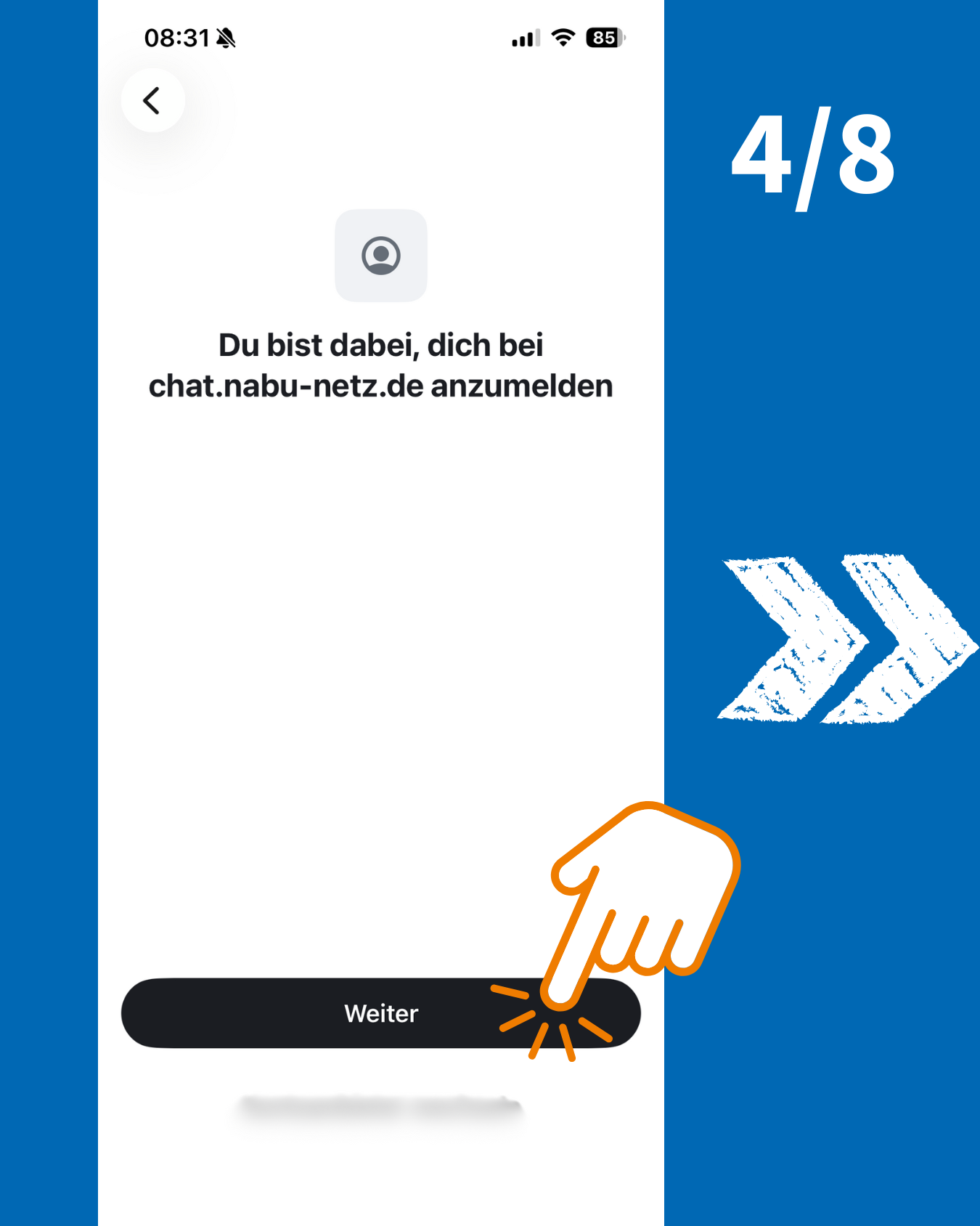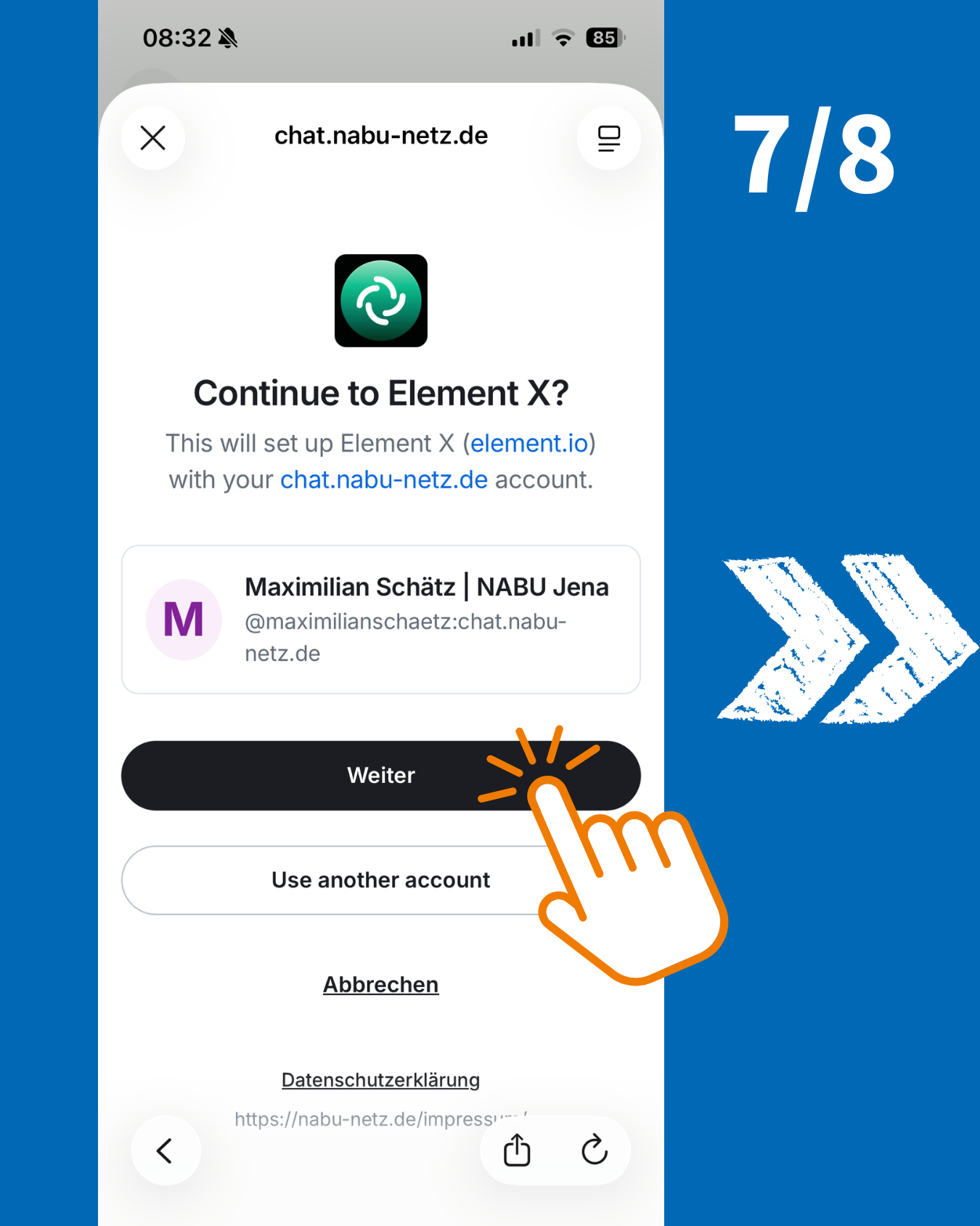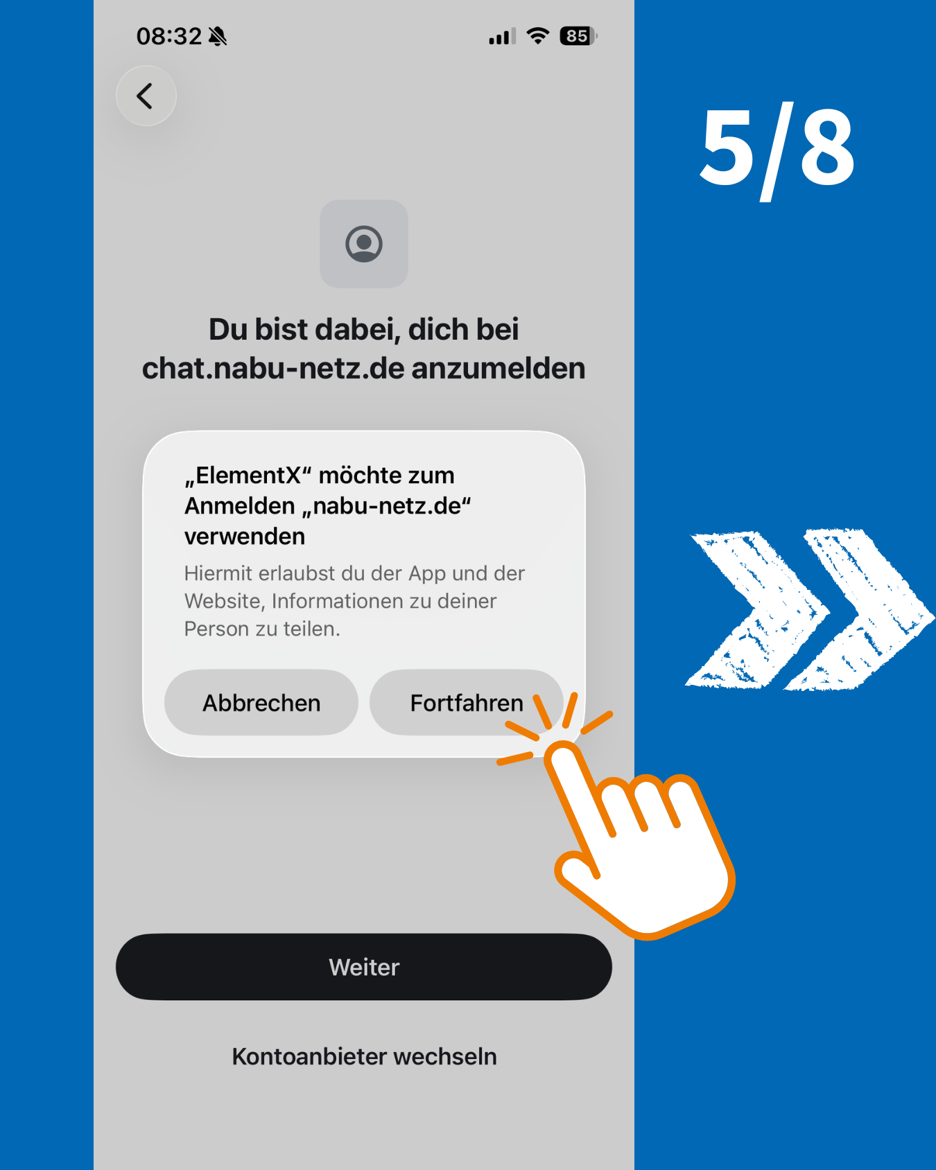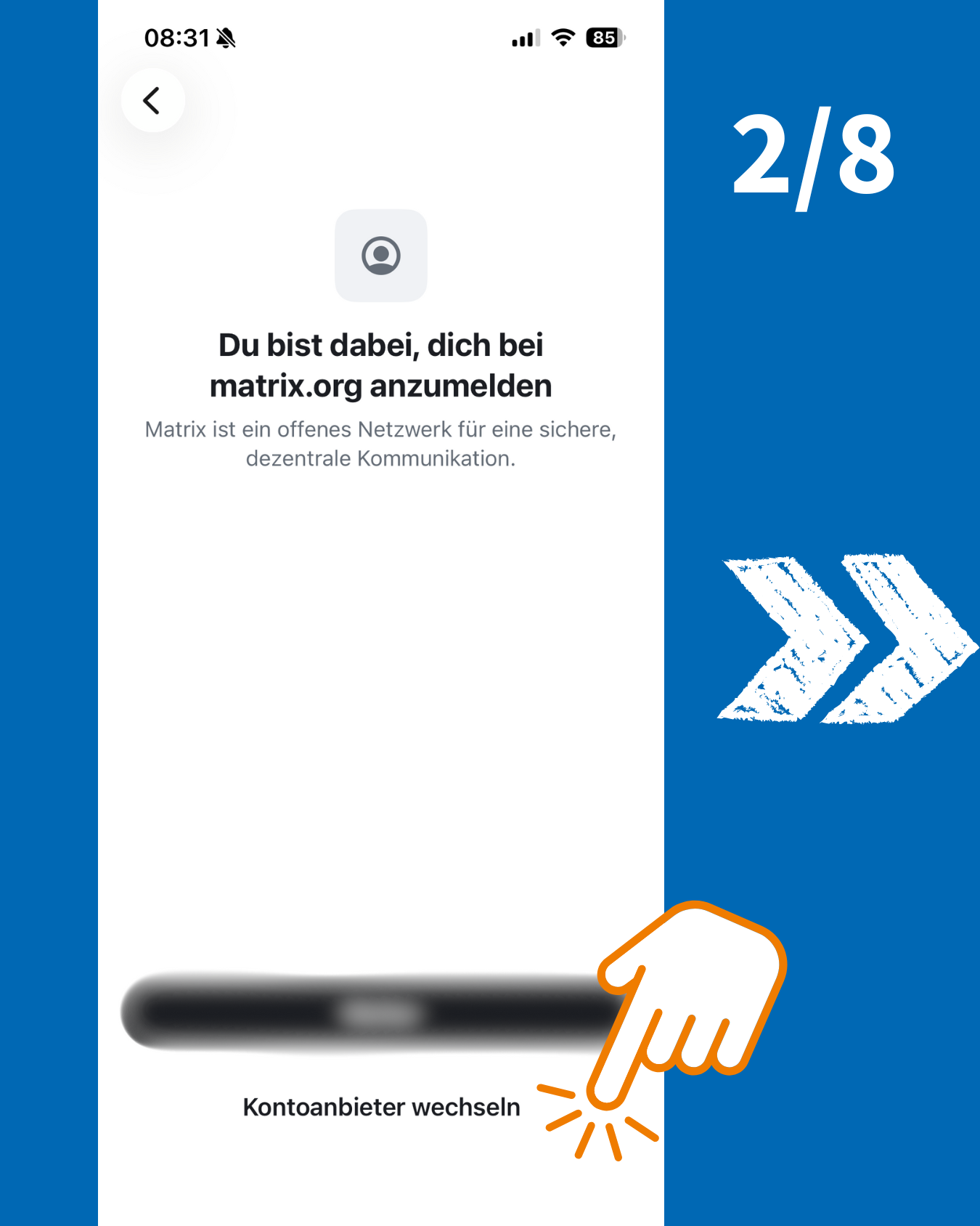 Danach wirst Du nach Deinem Heimserver gefragt. Im Standard steht hier matrix.org. Klicke auf "Kontoanbieter wechseln" und trage chat.nabu-netz.de ein. Danach